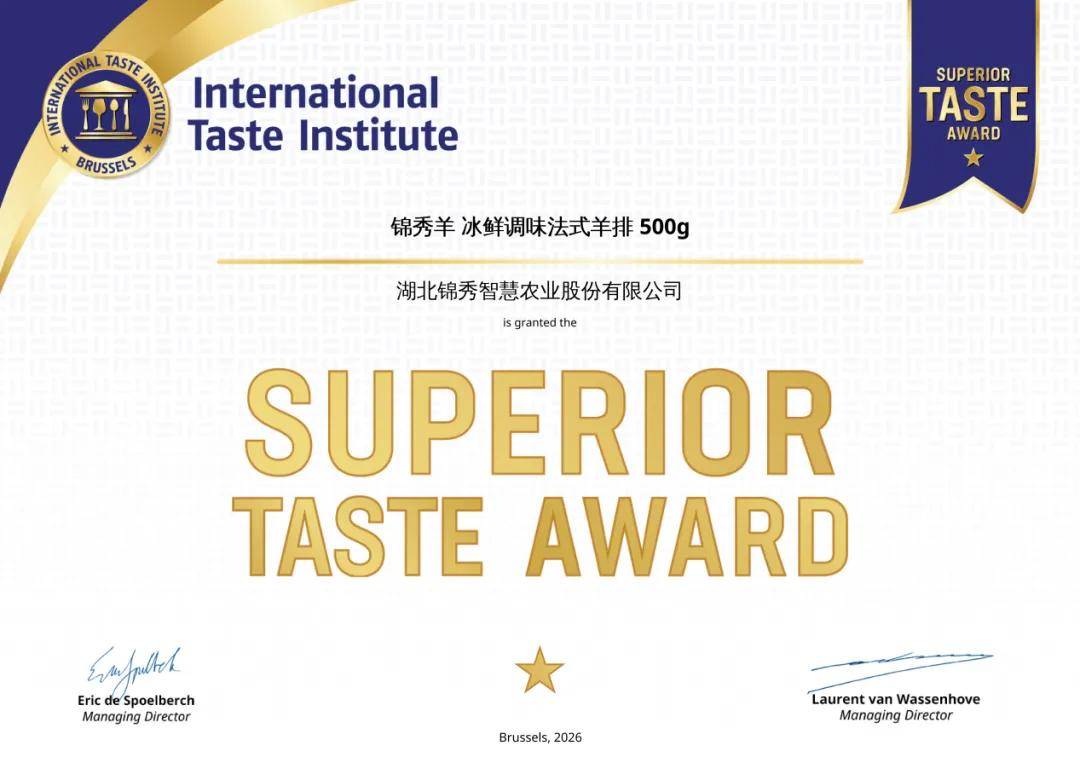 国际甘旨由比利时布鲁塞尔的国际风味评鉴所(International Taste Institute)创立,做为本土农业龙头企业,成为中国鲜羊肉产物正在国际舞台的味觉代言。锦秀羊的获并非偶尔,其评审尺度被业界誉为“全球食物质量黄金标尺”。
